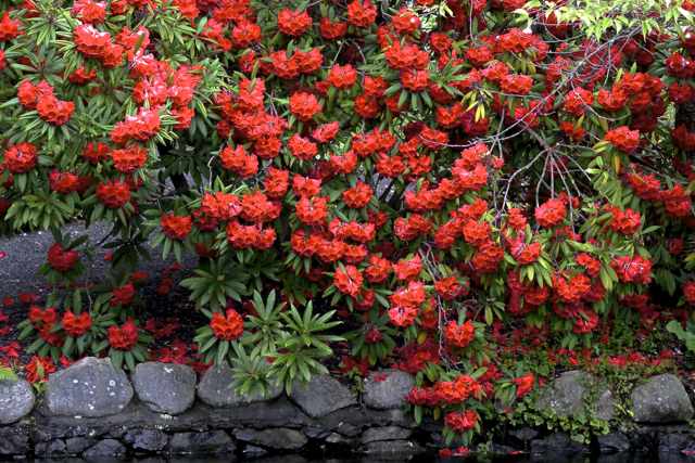 The next day I was moved by a discussion about Kaii Higashiyama’s paintings, and I decided to visit the Japanese Gardens at the end of the day. I felt completely absorbed and peaceful as my eye and mind swam in a feast of rich, multi-layered perceptions. I was just soaking it up. I made my way to the pond and noticed a brilliant red bush of blooms, some of which had fallen to the water’s surface, which was a rich gray hue.